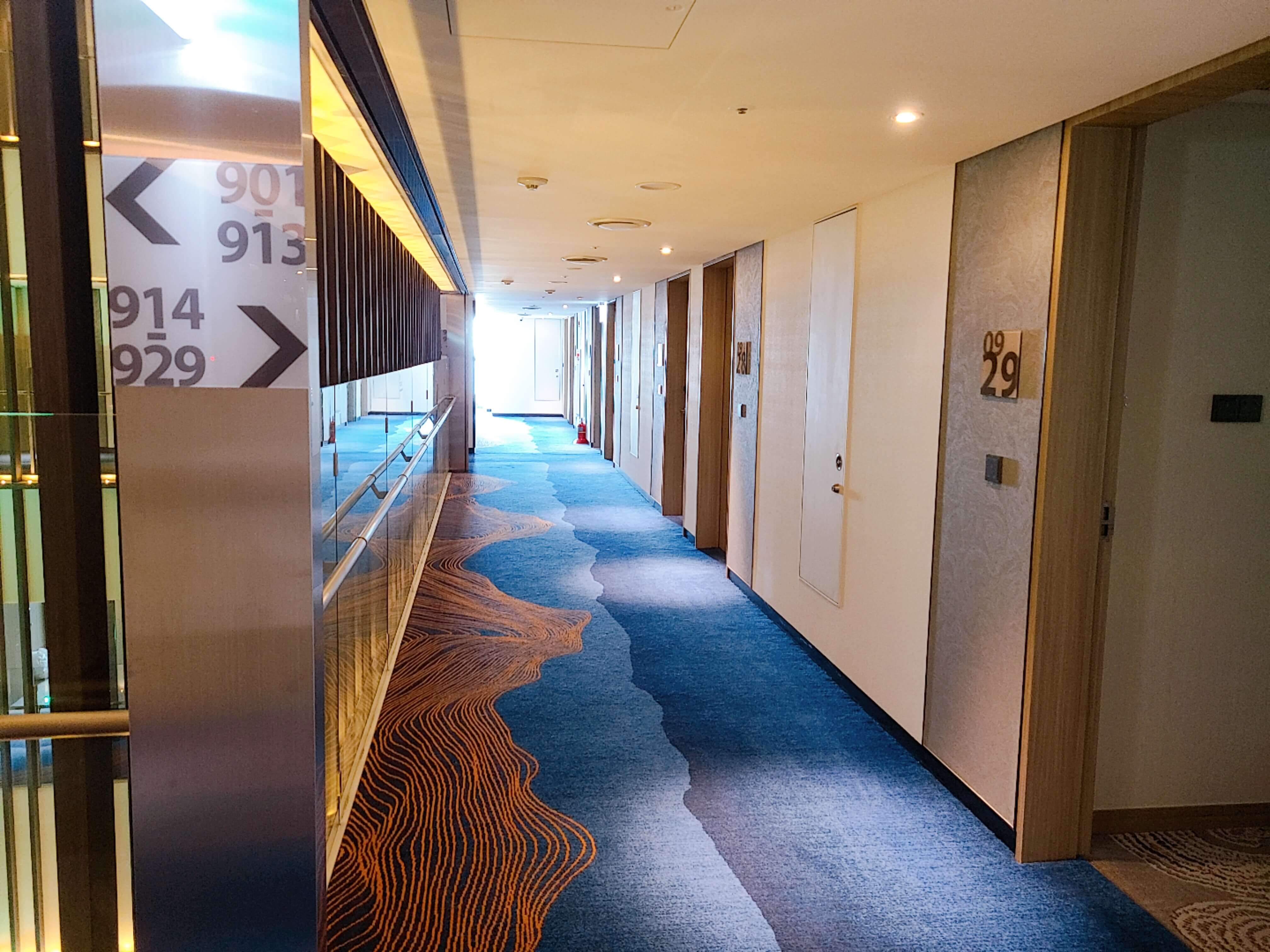 또 중앙 천장에 8층부터 16층까지의 객실을 통과하는 파도 형상의 조형물이 걸려있는데,